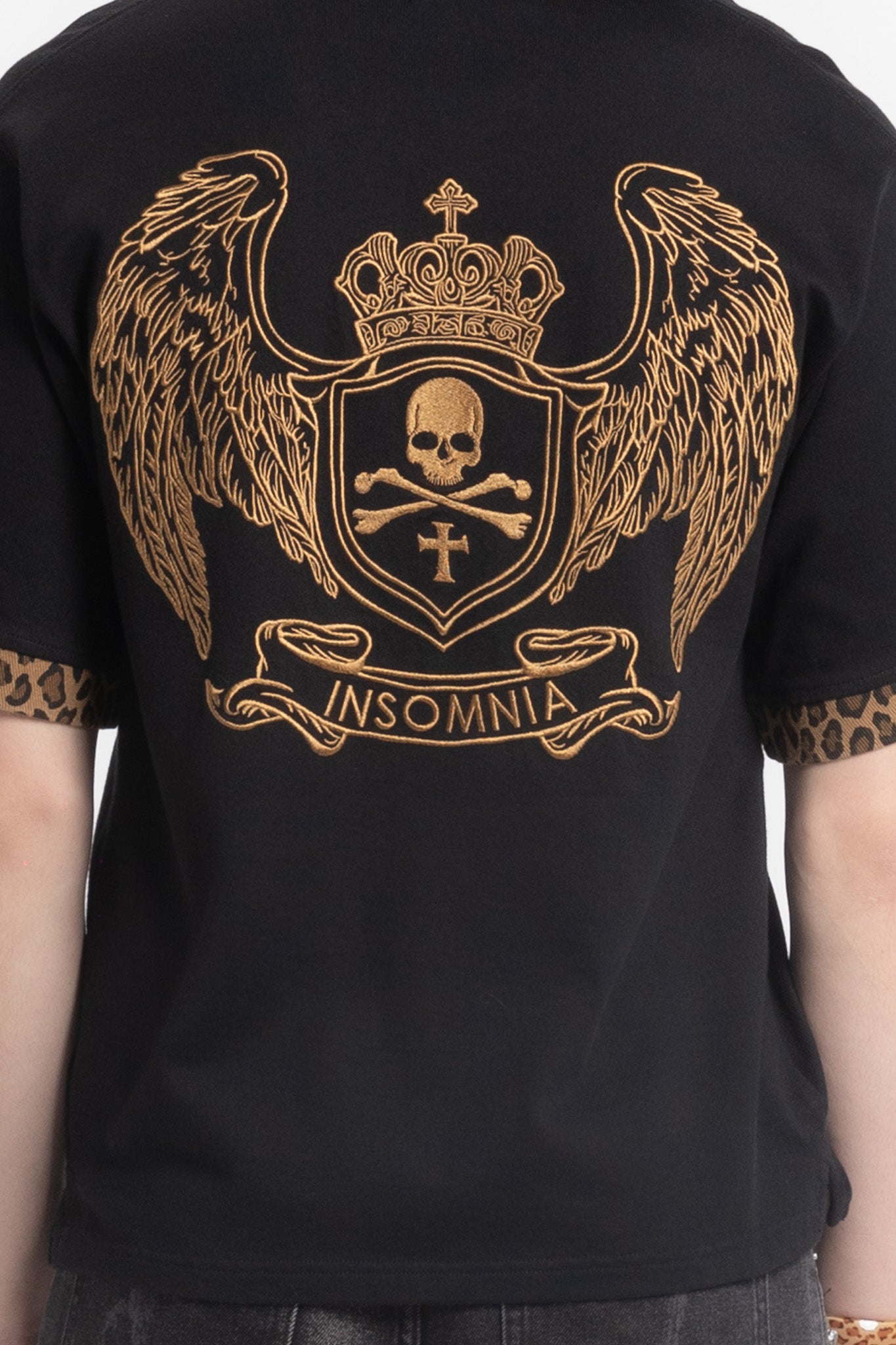 This polo features a mid-weight cotton construction with a solid black base, contrasted by cheetah-print details on the collar and sleeve cuffs. It’s accented with a gold crest-and-wings emblem on the chest and a large matching graphic across the back, finished with a clean placket front.