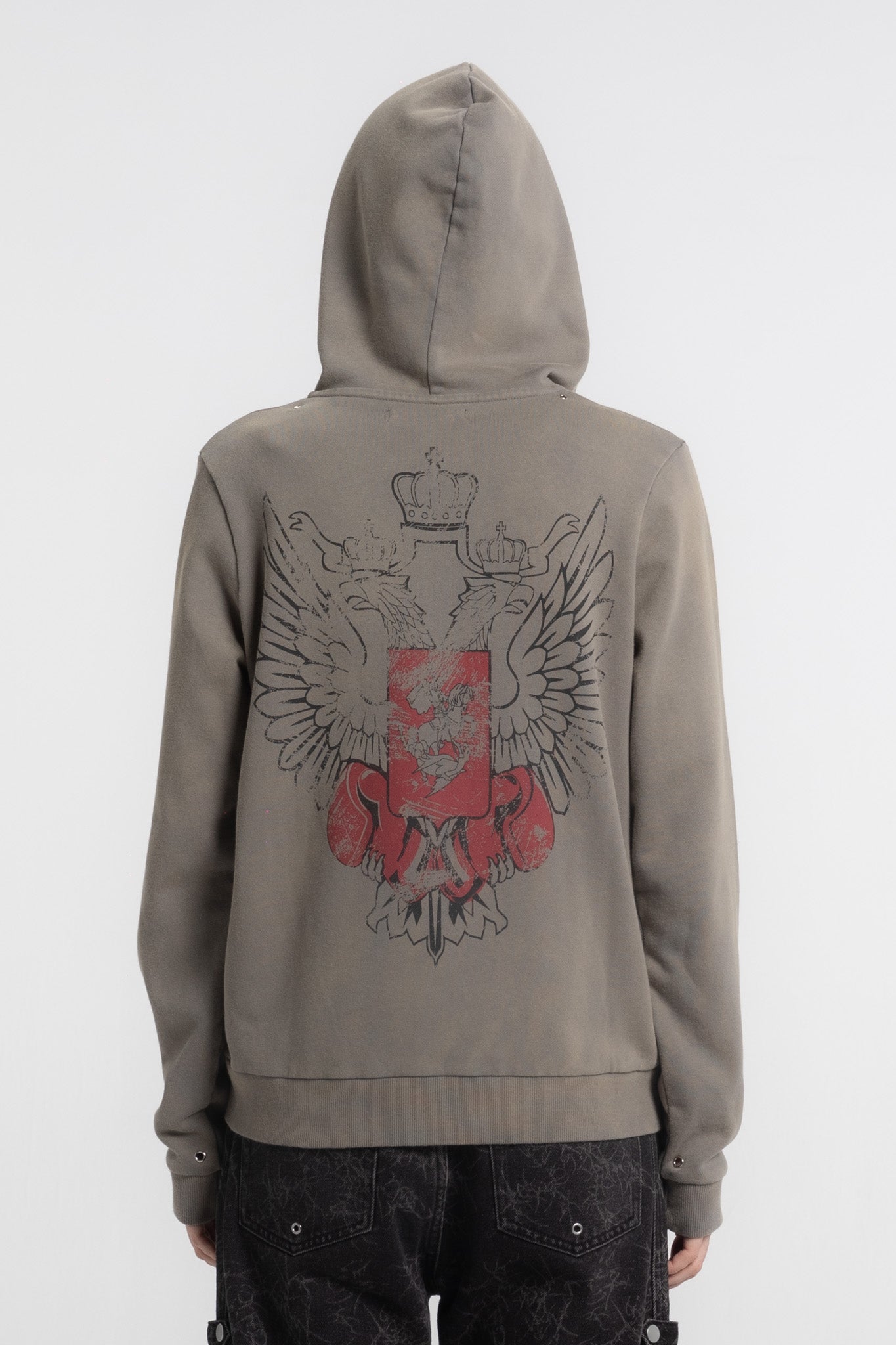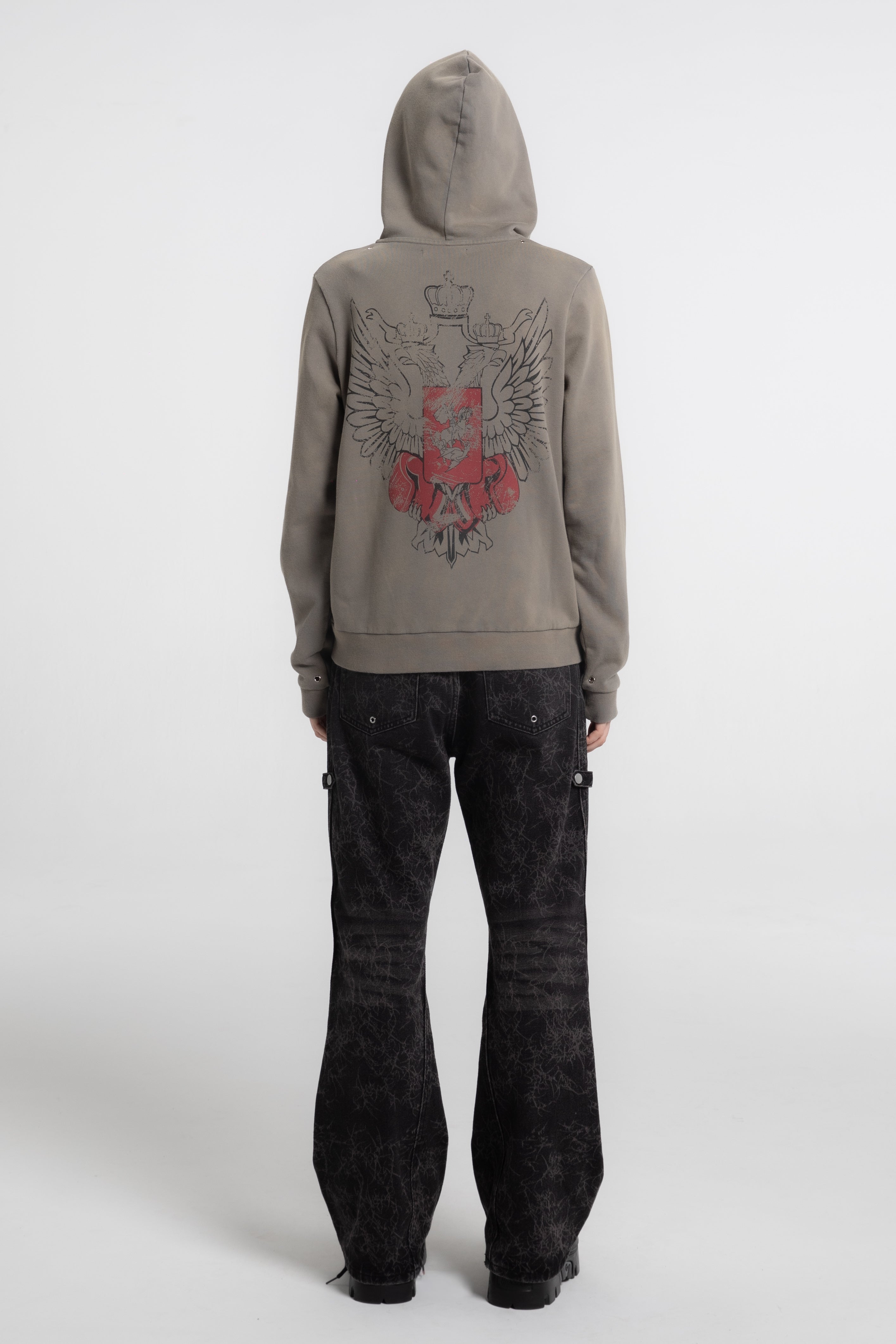 This hoodie features a mid-weight cotton-blend construction with a washed subtle olive finish, a full front zipper with a ring-pull detail, and a kangaroo pocket. It’s accented with a small front crest graphic and a large distressed eagle-crest print on the back, finished with ribbed cuffs and hem.