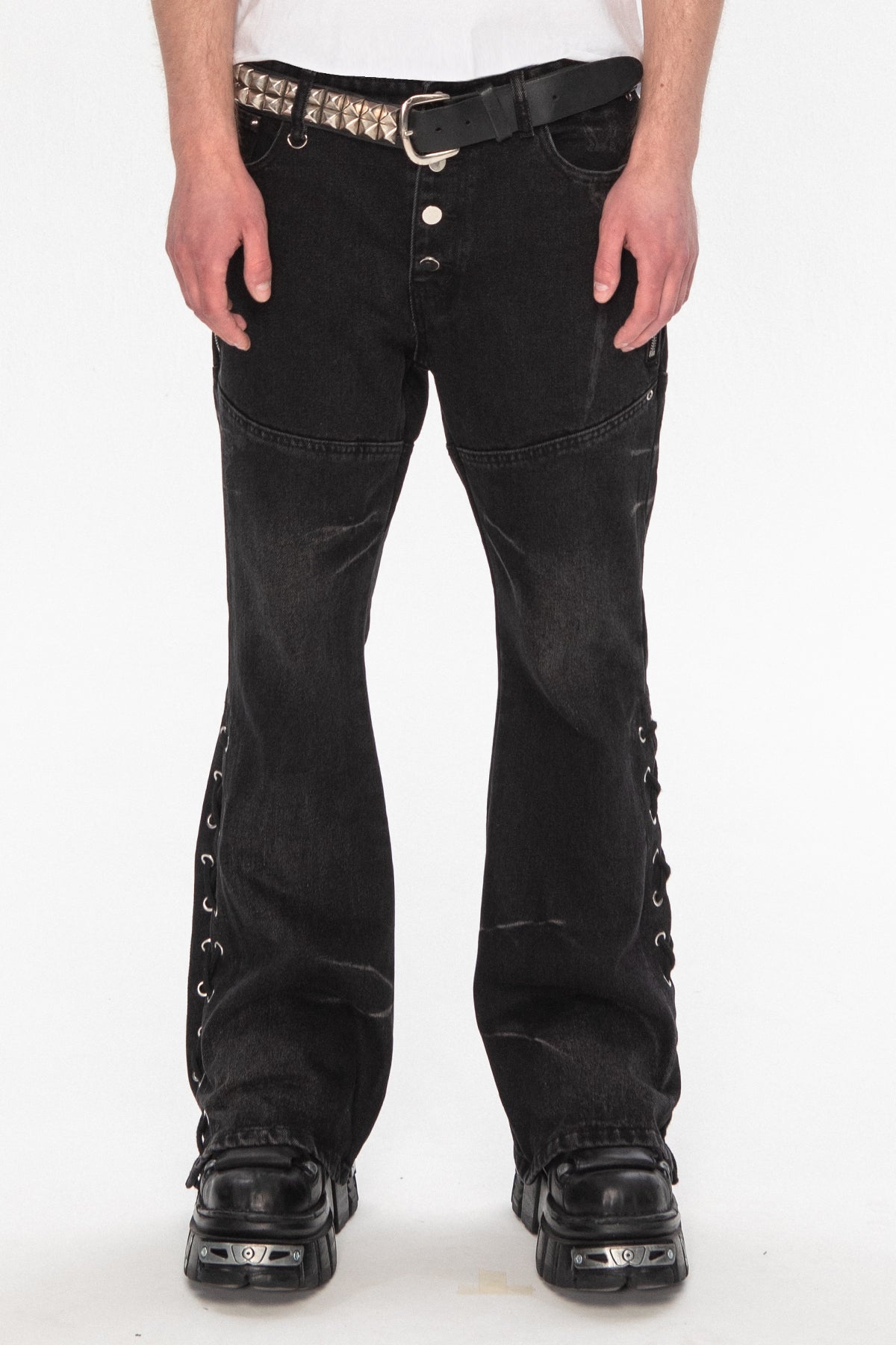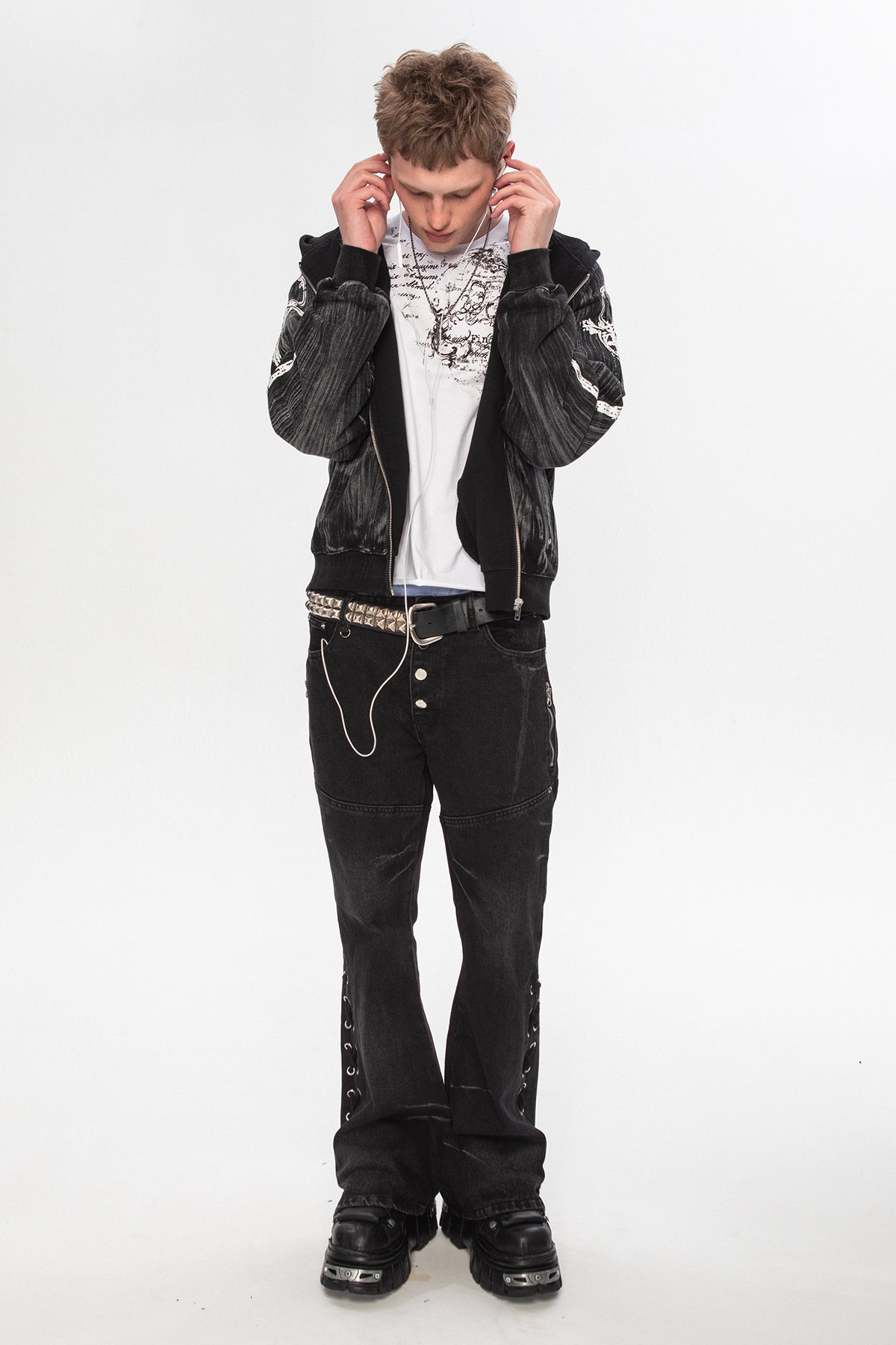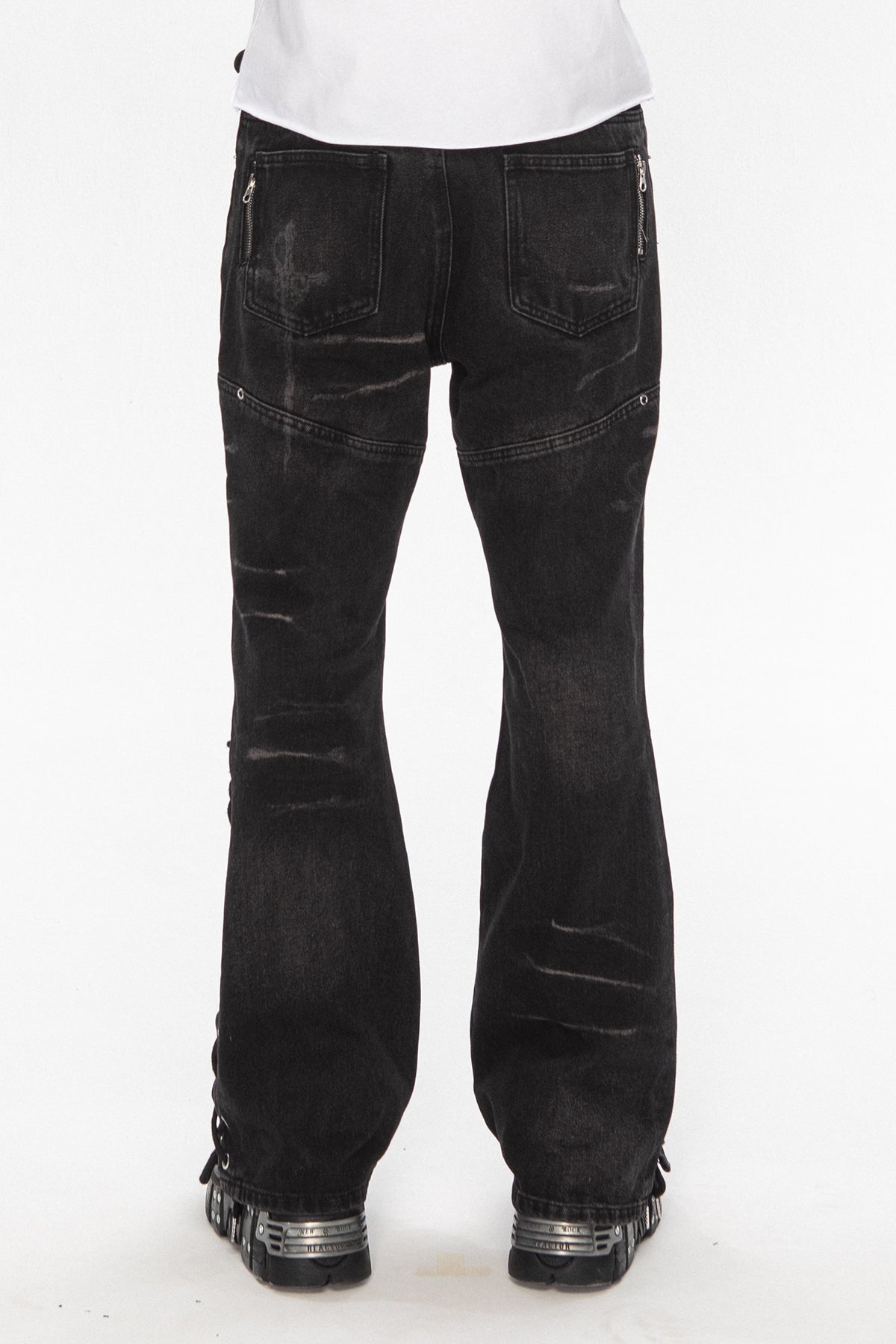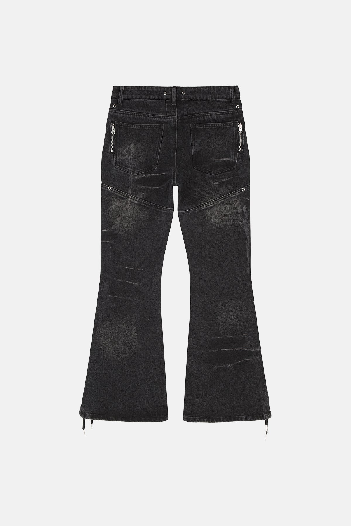 These jeans feature laser-engraved dagger graphics and fading throughout the front and back, with subtle whiskering and distressed hems. Finished with an adjustable flare at the leg opening.