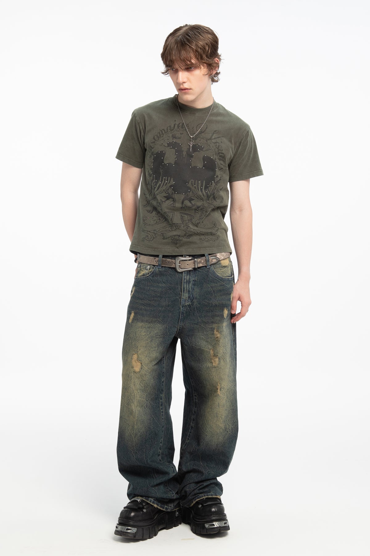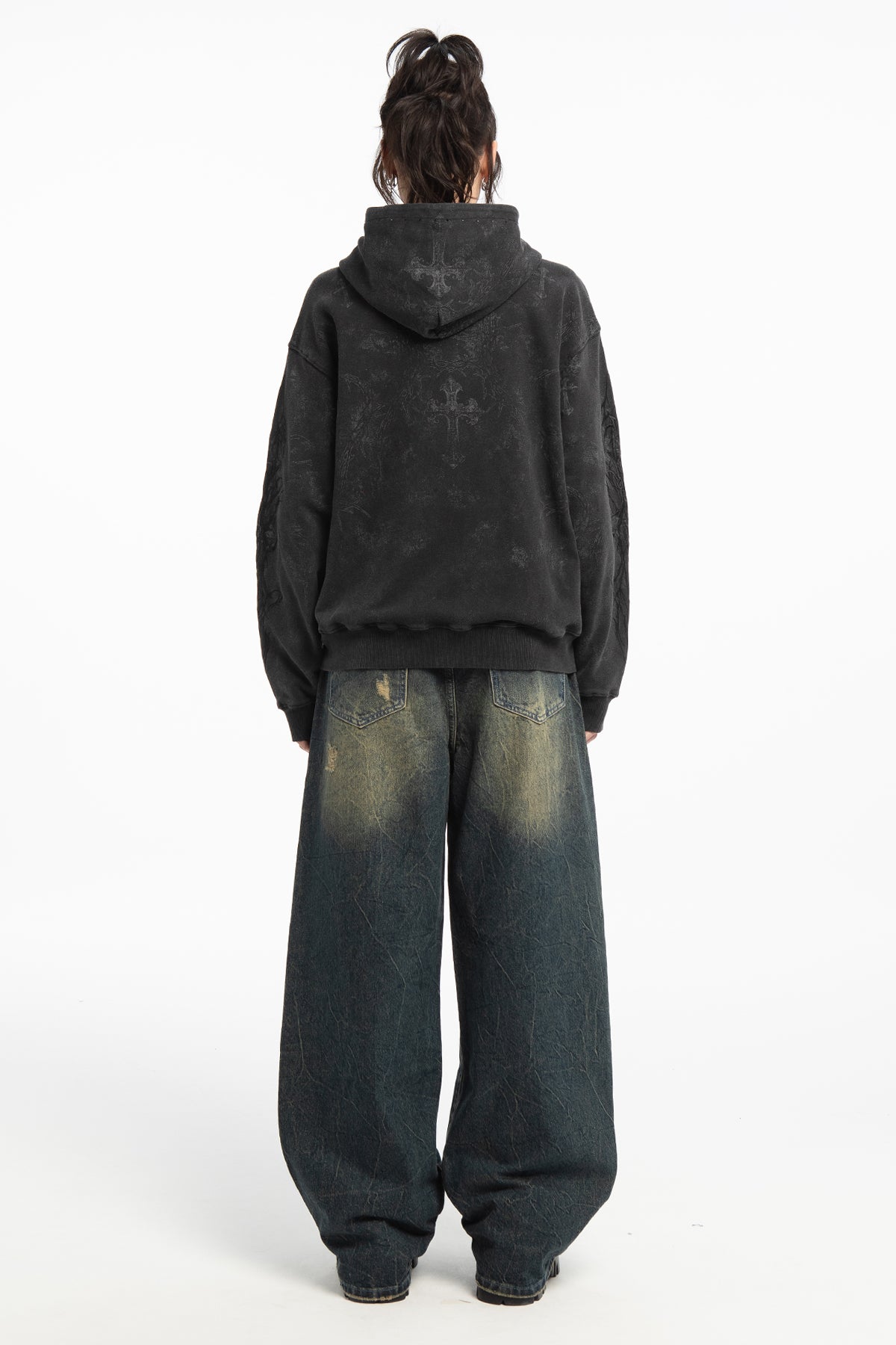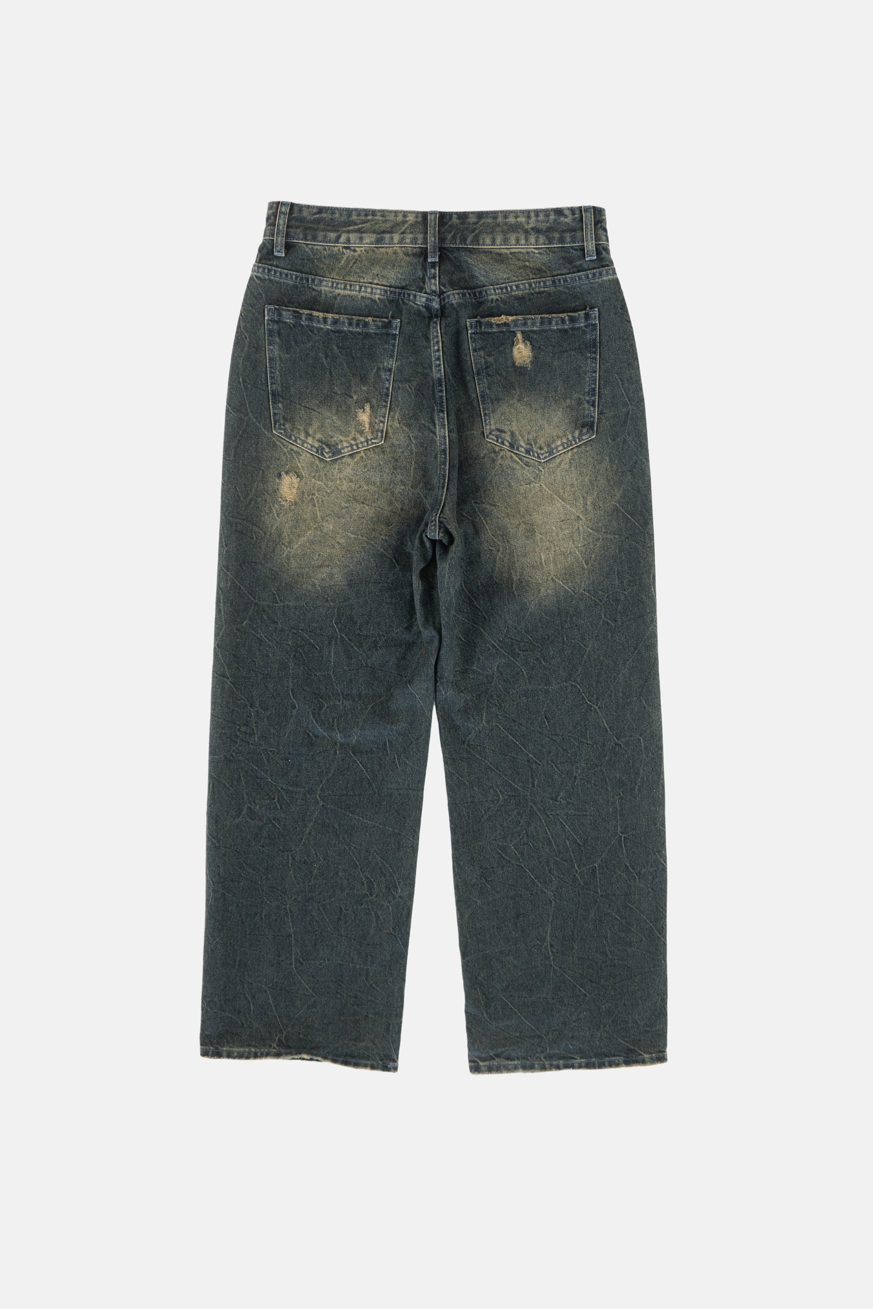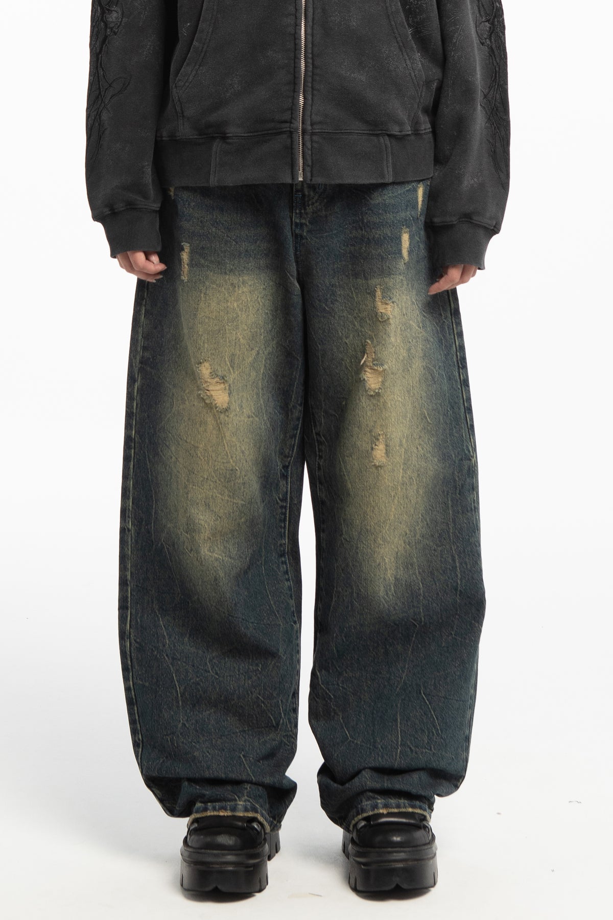 Baggy denim jeans with distressed details and a faded sandblast wash.