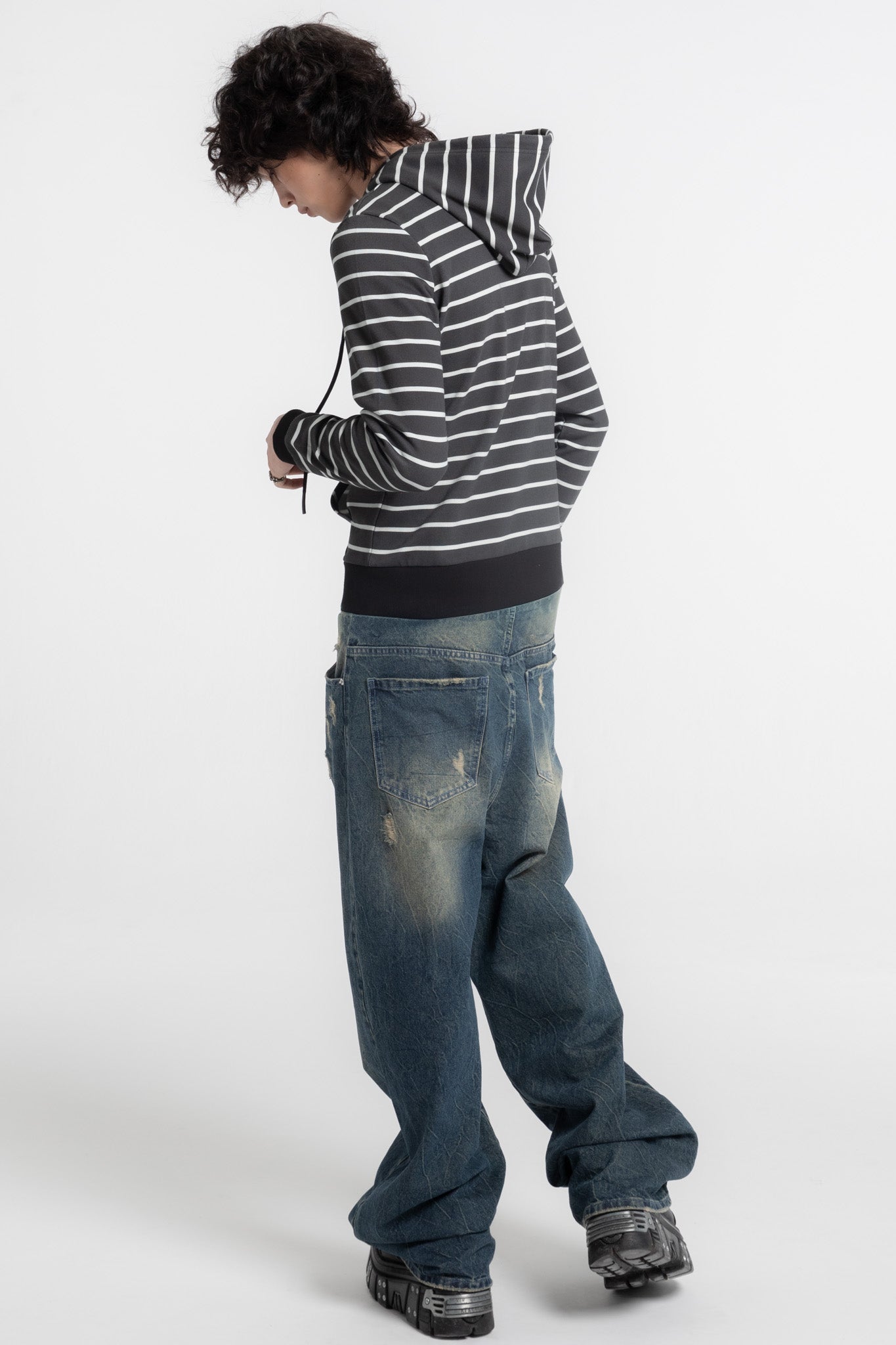 This hoodie features a mid-weight cotton blend construction with horizontal white stripes on a washed charcoal base. It includes a full front zipper with a ring-pull detail, a drawstring hood, and ribbed cuffs and hem.