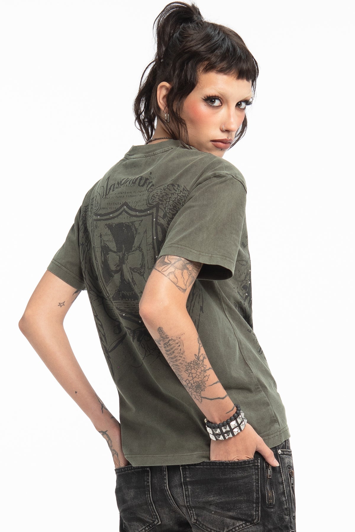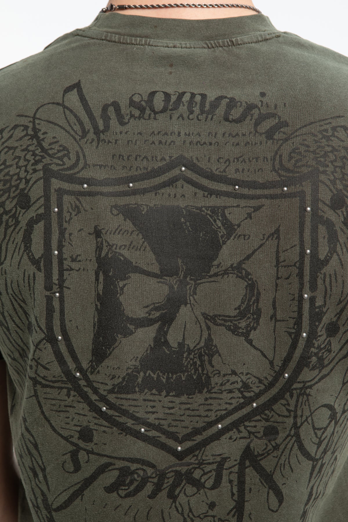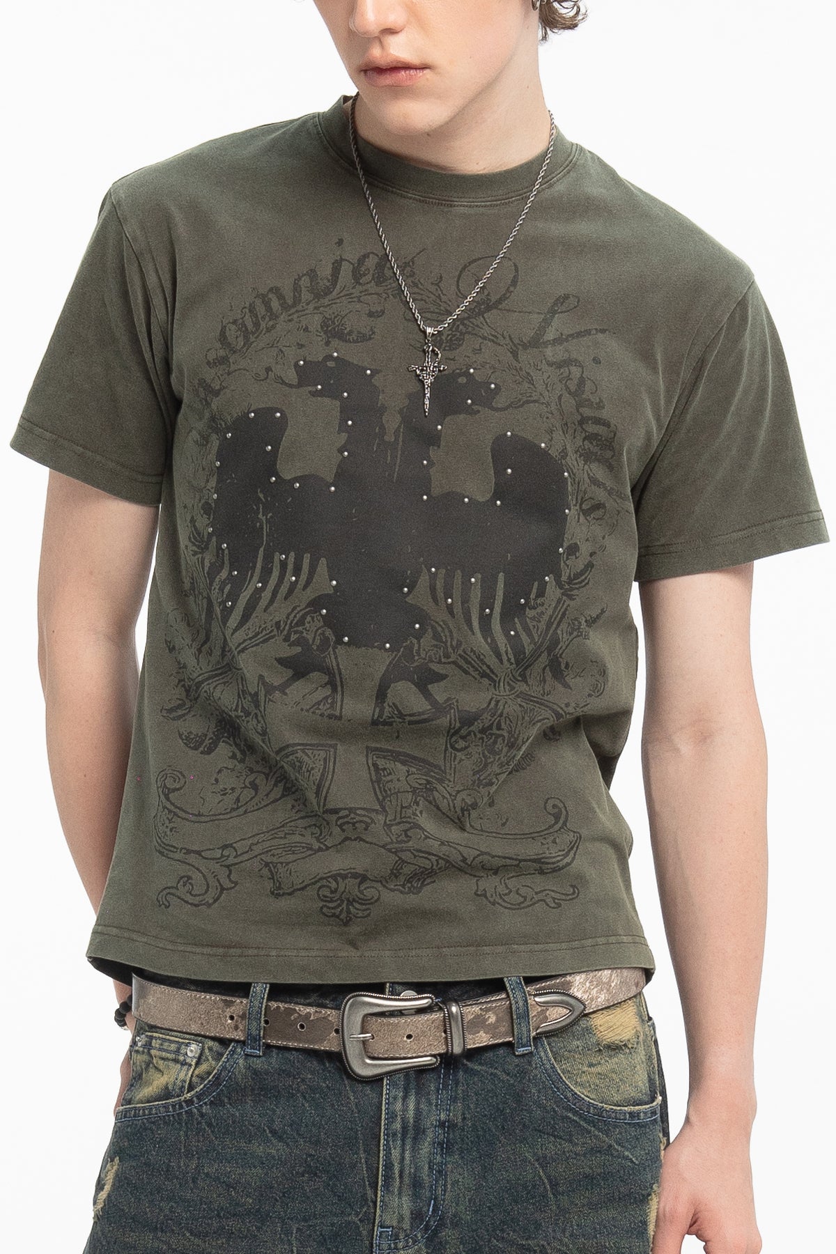 This tee has a 100% cotton construction, a washed olive green finish, and silk-screen printed graphics on the front and back. Studded details accent both sides.