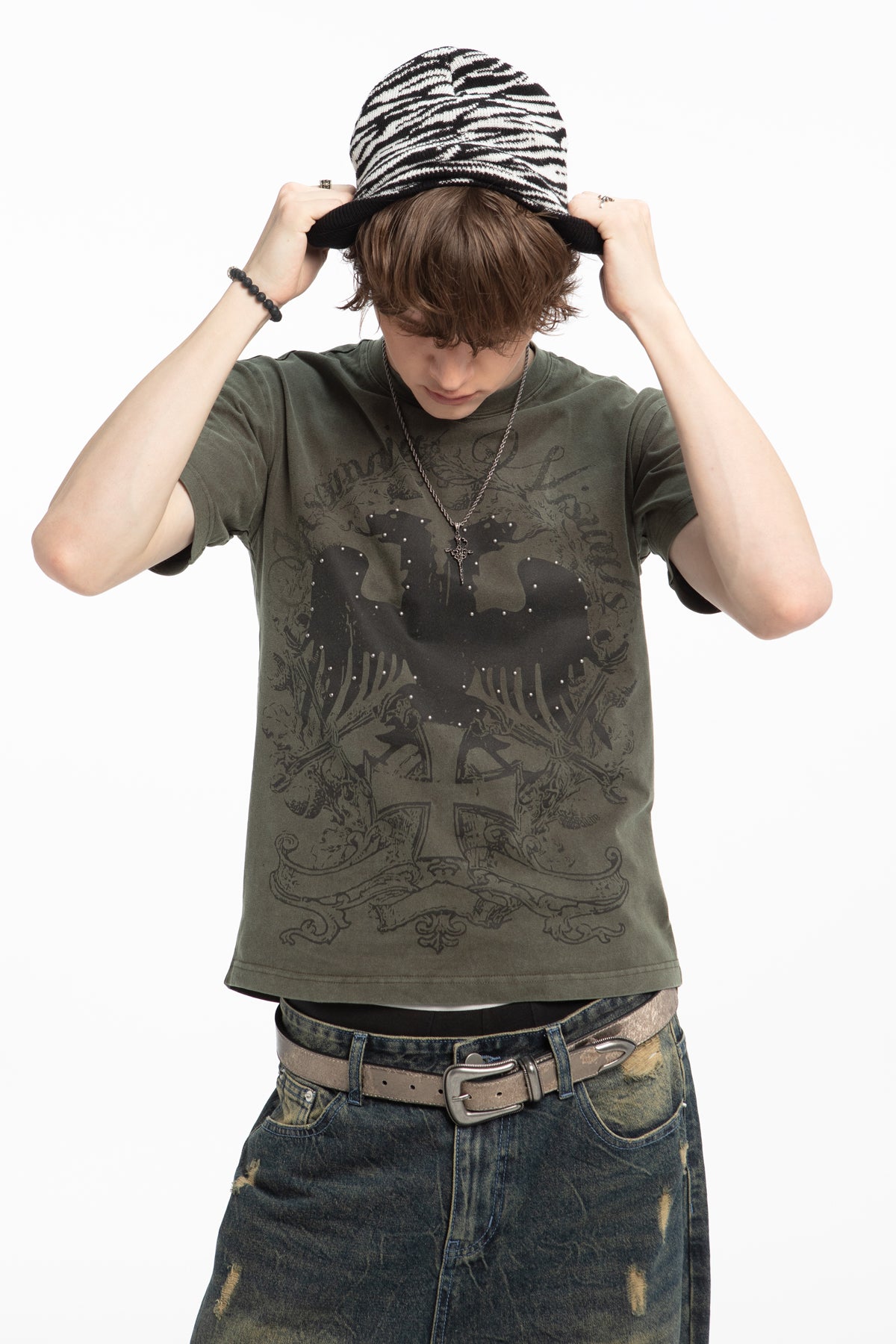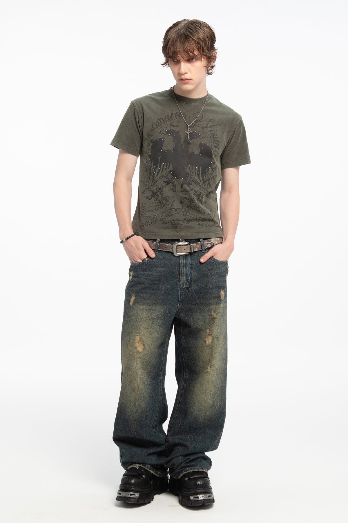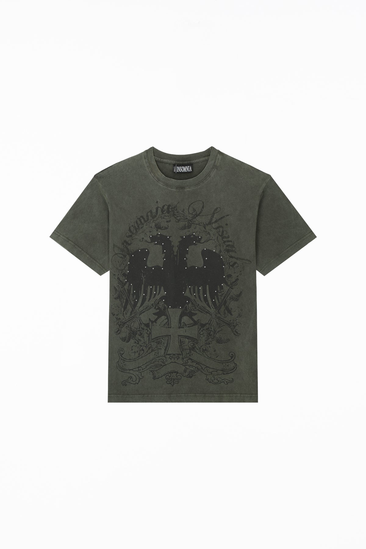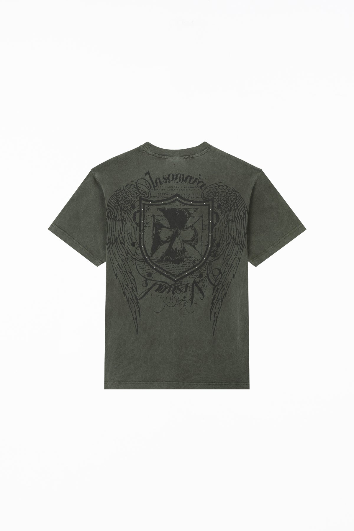 This tee has a 100% cotton construction, a washed olive green finish, and silk-screen printed graphics on the front and back. Studded details accent both sides.